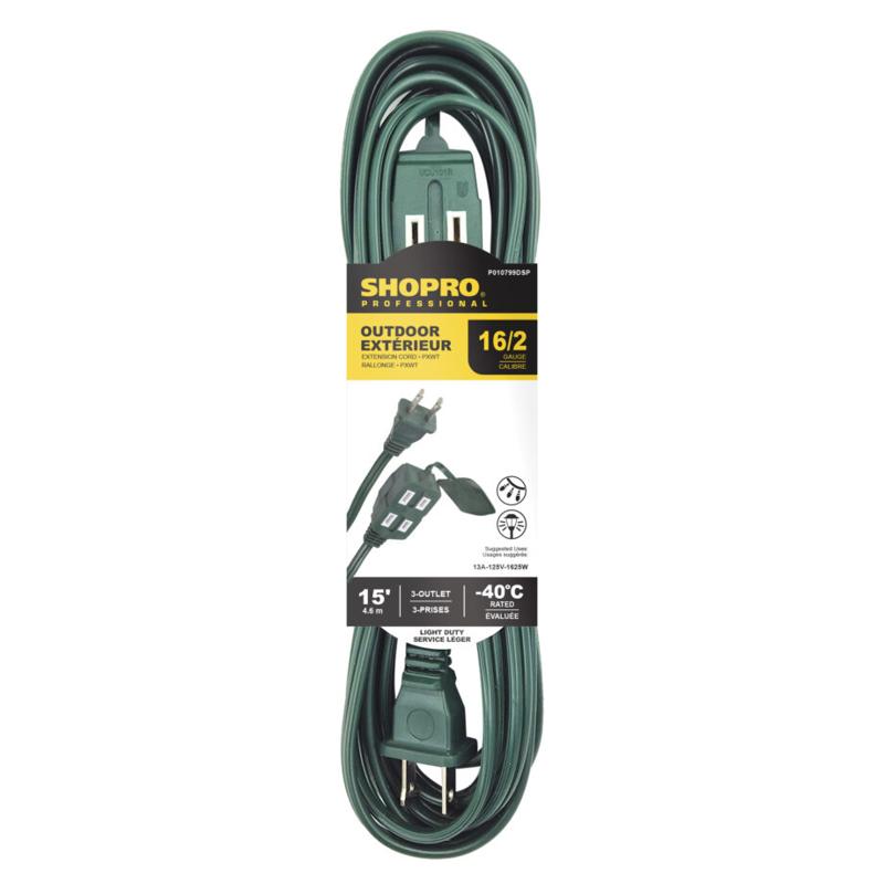 OUTDOOR EXTENSION CORD 16/2 PXWT 3-OUTLET X 15FT GREEN P010799DSP